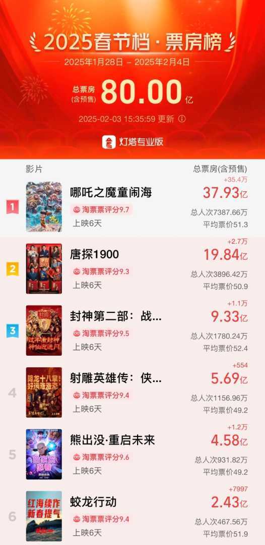 2025年春节档电影票房破80亿,刷新历史纪录