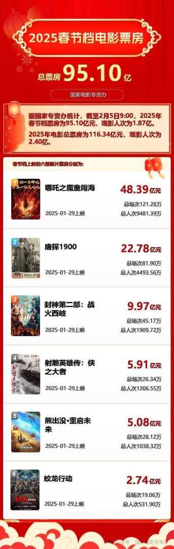 2025年春节档票房再创历史新高,达到95.10亿元!在经历了2024年多个档期的低谷后,电影业将宝押在今年春节档(1月28日至2月4日),六部影片竞相上映,试图一扫去年的票房阴霾。