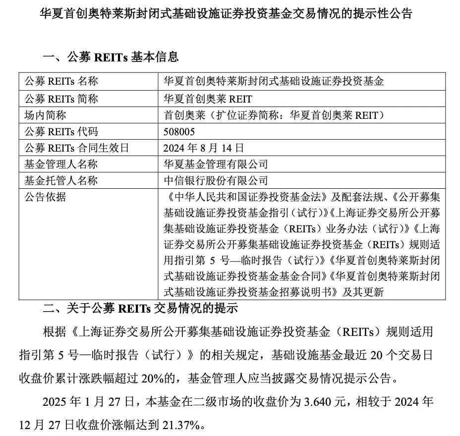 2月5日,华夏首创奥莱REIT与易方达华威市场REIT分别发布了交易情况提示公告。华夏首创奥莱REIT在二级市场的收盘价相较于前一月涨幅达到21.37%,而易方达华威市场REIT的收盘价也实现了7.85%的涨幅。两家基金公司均表示,其基础设施项目经营稳定,基金投资运作正常,无应披露而未披露的重大信息。