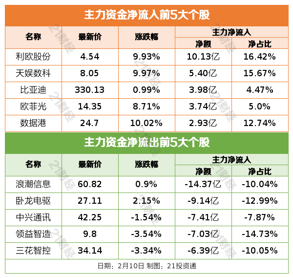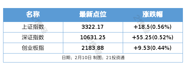 昨日A股2月10日,市场全天震荡走高,三大指数小幅上涨。截至收盘,沪指涨0.56%,深成指涨0.52%,创业板指涨0.44%。沪深两市全天成交额1.73万亿元,较上个交易日缩量2294亿元。