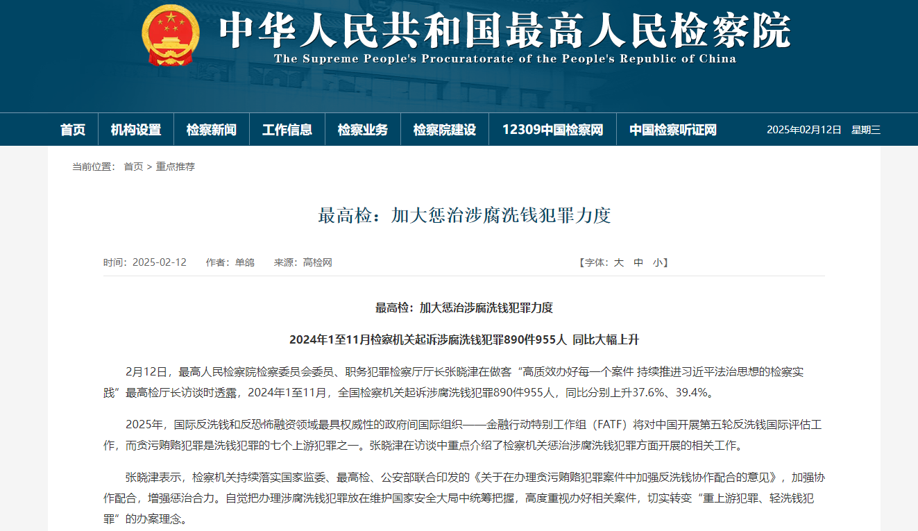 2月12日,最高检网站消息,最高人民检察院检察委员会委员、职务犯罪检察厅厅长张晓津表示,2024年1至11月,全国检察机关起诉涉腐洗钱犯罪890件955人,同比分别上升37.6%、39.4%。