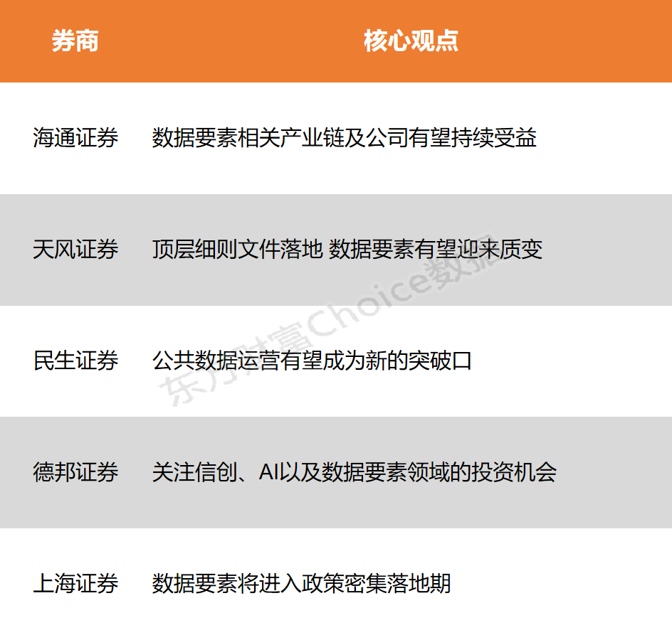 多家券商对此进行了解读。海通证券认为,当前政策组合已形成明显合力,旨在推动数据要素市场化配置改革,充分释放数据要素市场潜能,相关产业链及公司有望持续受益。天风证券则指出,随着数据要素顶层细则文件的落地,典型应用案例将加速推广,产业有望迎来质变。德邦证券则认为,国产数据资源的再分配,从运营到应用创新有望放宽。