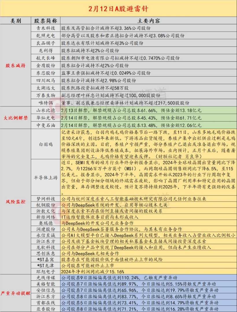 财联社2月12日投资避雷针,近日,A股及海外市场潜在风险事件如下: