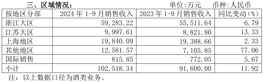 会稽山表示,公司遵循黄酒“高端化、年轻化、时尚化”发展方向,实施“会稽山、兰亭”双品牌战略,持续布局高端化、年轻化产品赛道。1-9月经营数据显示,包括气泡黄酒在内的“其他酒”营收同比增长51.09%,浙江仍是销售最大市场,经销商数量最多。