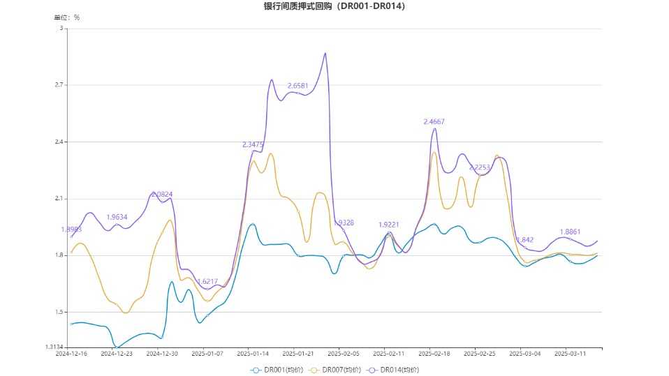 银行间质押式回购市场方面,中短期品种均出现小幅上涨,且均站上1.8%关口,R007品种成交占比达15%,市场资金成本有所上升。具体来看,DR001、R001加权平均利率分别上行2.9BP、3.3BP,报1.8001%、1.8111%,成交额分别增加;DR007、R007加权平均利率分别上行,市场资金成本继续攀升。此外,DR014、R014加权平均利率也有所上行,市场资金流动性面临一定压力。