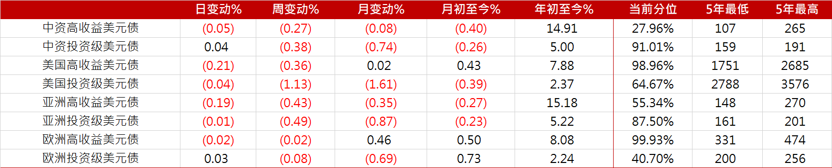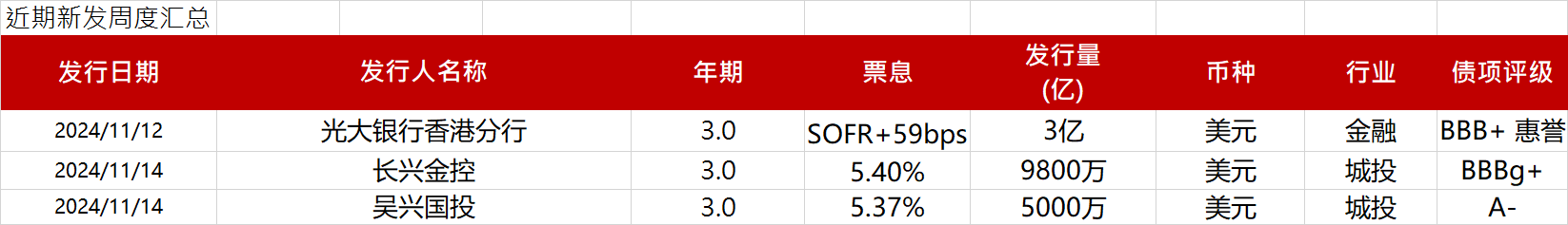 一级市场方面,本周未见中资机构涉足美元债新发领域,市场保持静默态势;