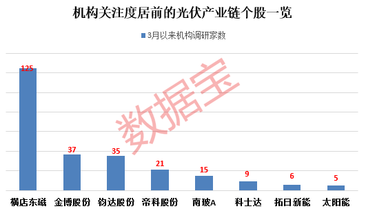 3月以来,随着光伏产品价格相继出现反弹,行业关注度有所提升。A股中超10只个股获得机构调研,不少公司在调研活动中发布积极信号。其中,横店东磁获得125家机构调研,钧达股份获得35家机构调研,均表示对未来光伏行业发展的信心。