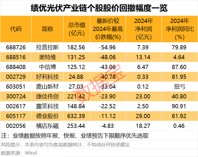 结合业绩数据来看,2024年绩优个股仅9只。其中,德业股份的净利润规模最高,预测净利润约29亿元~31亿元,同比增长61.92%~73.09%。而拉普拉斯作为领先的高效光伏电池片核心工艺设备及解决方案提供商,虽然股价回调幅度较高,但2024年公司营业总收入和净利润均实现大幅增长。
