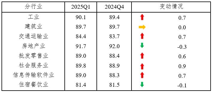 分行业指数5升1平2降。一季度,工业、社会服务业指数持续增长,环比分别增长0.7、0.9点。交通运输业、批发零售业指数由平稳转为增长,环比分别增长0.7、0.6点。信息传输软件业指数由下滑转为增长,环比增长0.7点。建筑业指数保持平稳。房地产业、住宿餐饮业指数继续下滑,环比分别下降0.3、0.1点,行业运行总体平稳。