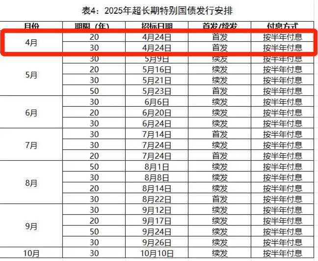 同时,2025年中央金融机构注资特别国债也于4月24日发行,金额为1650亿元,期限为5年期,加权中标利率1.45%。