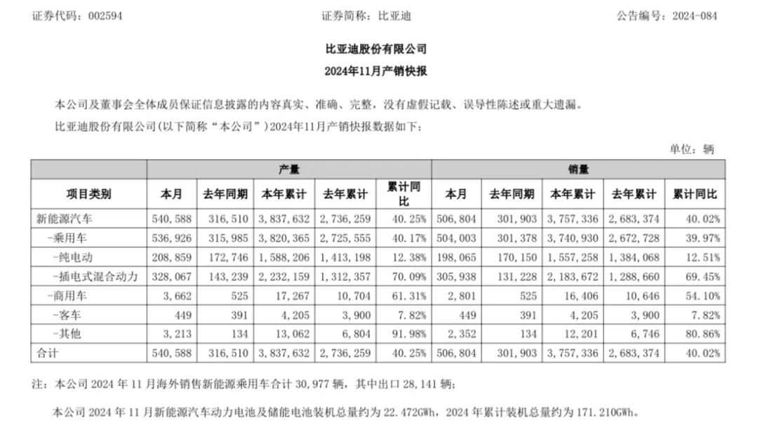 比亚迪继续领跑市场,11月单月销量达到50.68万辆,今年累计销量已突破375万辆,同比增长40.02%。海外销售方面,比亚迪11月新能源乘用车出口量达到2.81万辆。此外,小米汽车、理想汽车、岚图汽车、广汽埃安等多家车企也表现出色,单月交付量均实现大幅增长。