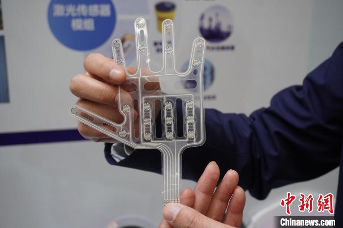 12月1日,河南郑州2024传感器大会现场,工作人员正在展示一款柔性压力传感器。中新社记者韩章云摄
