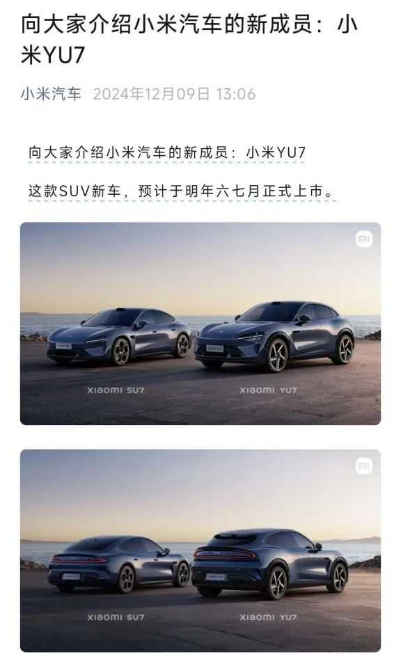 小米汽车官方于12月9日正式揭晓了其首款SUV车型YU7,标志着小米汽车家族又添一员大将。这款备受期待的新车预计将于明年六七月正式上市,成为小米在SUV领域的开山之作。