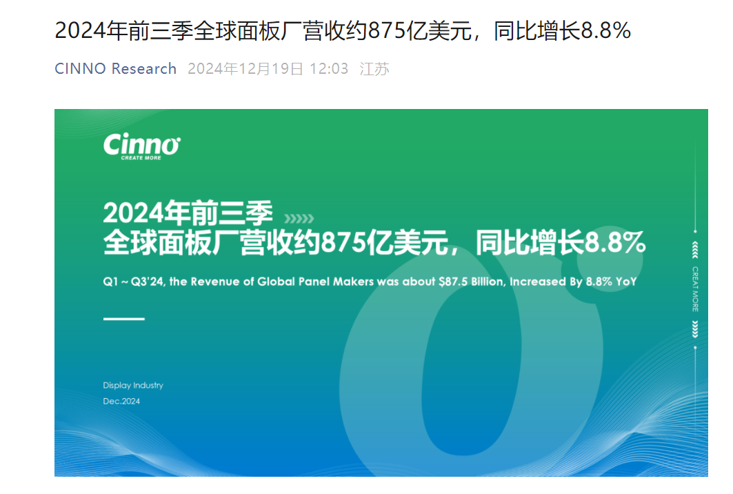 据CINNO Research报告,2024年前三季度全球面板厂营收约875亿美元,同比增长8.8%,市场复苏态势强劲。