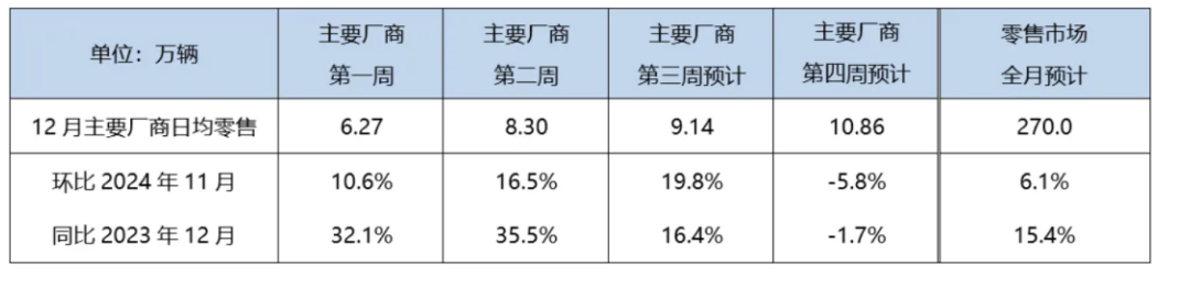 根据乘联分会最新发布的统计数据,今年12月首周,国内汽车市场日均零售量达到了6.27万辆,同比增长32.1%,环比增长10.6%。进入第二周,车市热度持续攀升,日均零售量跃升至8.30万辆,同比增长35.5%,环比增长16.5%。而第三周,市场预计日均零售量将进一步增长至9.14万辆,同比增长16.4%,环比增长19.8%。