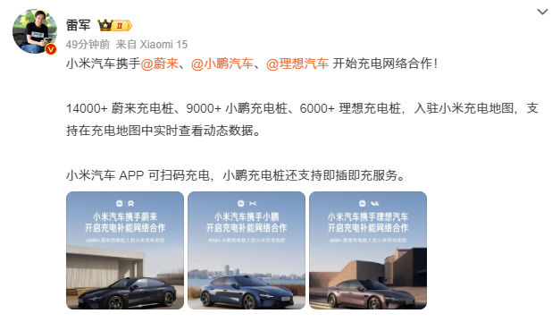 12月25日,小米集团创始人、董事长兼首席执行官雷军通过微博宣布,小米汽车与蔚来、小鹏汽车及理想汽车正式达成充电网络合作。此次合作将覆盖蔚来超14000个充电桩、小鹏超9000个充电桩以及理想超6000个充电桩,这些充电桩将全面入驻小米充电地图,为用户提供实时动态的充电信息。