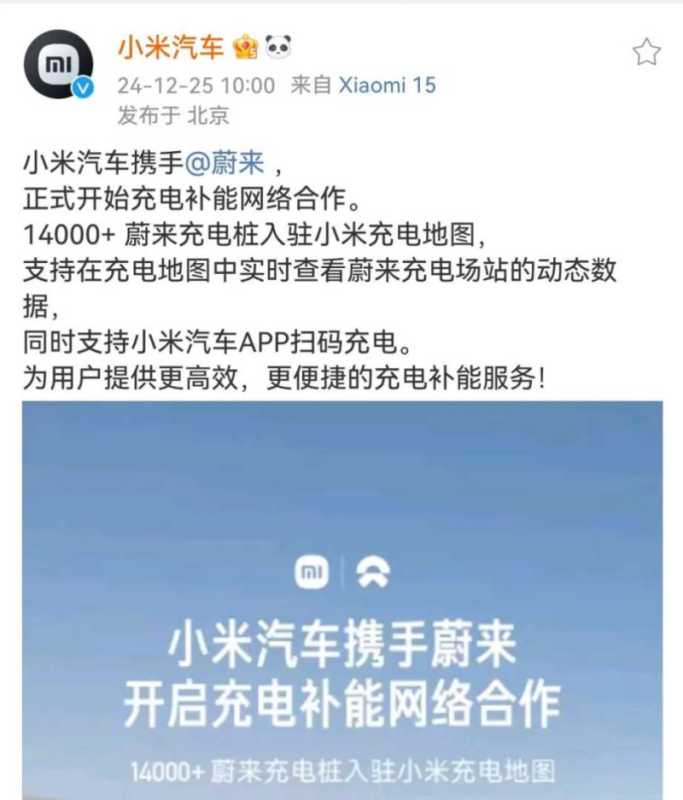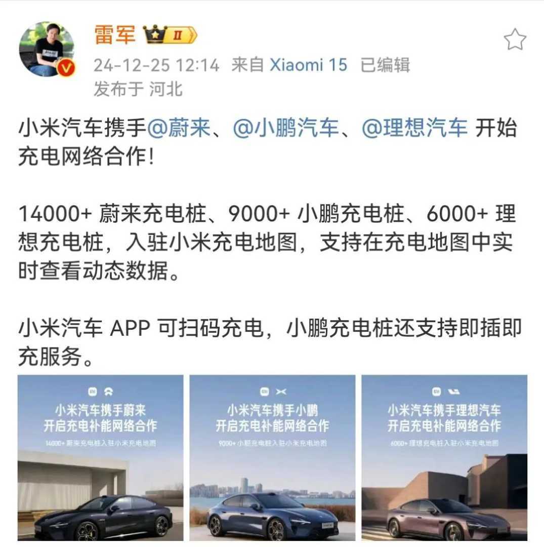 12月25日,小米创办人雷军通过微博宣布,小米汽车与蔚来、小鹏汽车、理想汽车达成充电补能网络合作,标志着小米汽车正式进军新能源汽车充电领域。