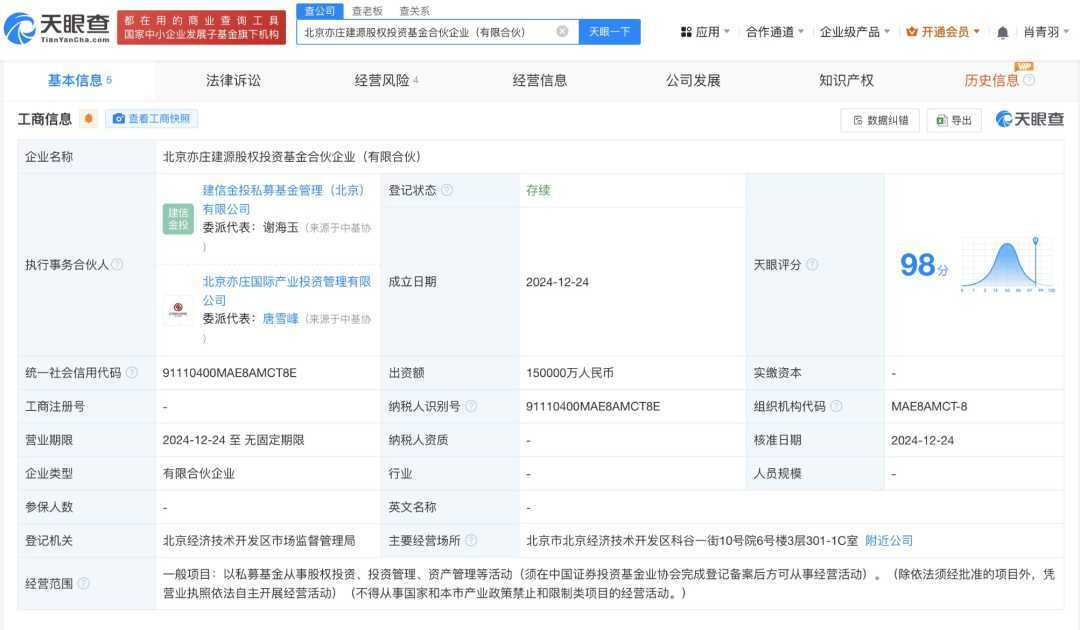 北京亦庄建源股权投资基金合伙企业近日成立,由建信金投私募基金管理和北京亦庄国际产业投资管理有限公司共同执行事务,出资额15亿元,主要经营私募股权投资、管理等活动。