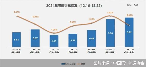 12月第三周全国二手车日均交易量达6.92万辆,环比增长0.53%,同比11月增长5.2%,预计全月交易量有望突破185万辆,创下年内月度交易新高。