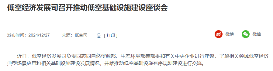 此外,该司还与自然资源部、生态环境部等部委及多家中央企业进行了座谈。会上,各方围绕低空经济典型场景应用、相关基础设施建设的发展现状以及未来规划展开了热烈讨论,并着重探讨了如何有序推动低空基础设施的规划建设。