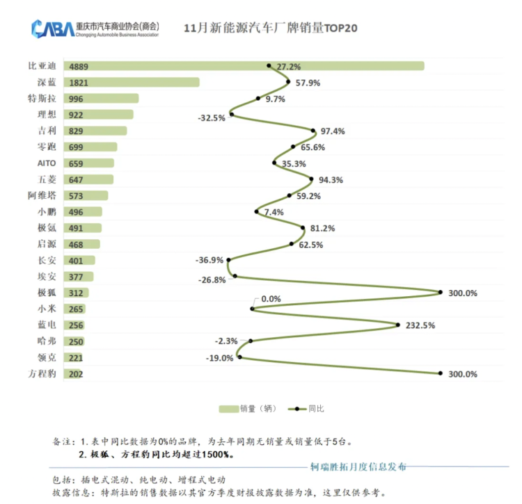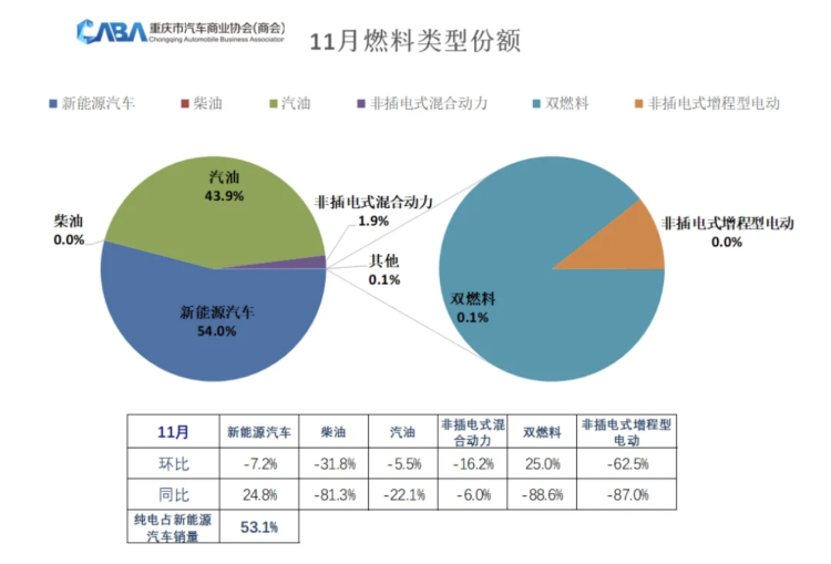 重庆市汽车商业协会发布数据显示,11月份重庆市场狭义乘用车销量为3.52万辆,新能源汽车单月销量1.93万辆,占比达到54.0%,同比增长24.8%。中国品牌连续数月保持正增长,燃油车市场形势不容乐观。