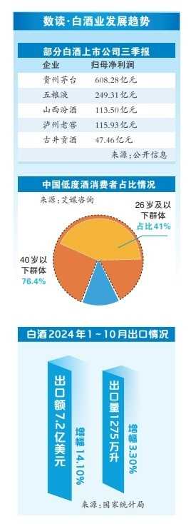 “白酒国际化”是近年来白酒行业的重要议题。2023年,中国白酒头部企业开始集中出海;2024年,白酒国际化进程取得显著进展。业内人士普遍认为,2025年,加深国际化布局将成为中国白酒的必然之举。从数据来看,2024年1~10月,中国白酒出口额为7.2亿美元,增幅14.1%;出口量1275万升,增幅3.3%。出口额增幅明显高于出口量,业绩表现亮眼。政策层面也利好中国白酒“向外”发展。