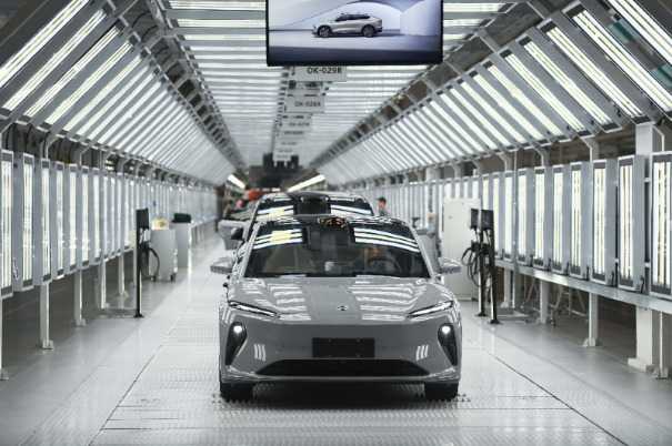 这是安徽省合肥市新桥智能电动汽车产业园蔚来第二工厂内的新能源汽车生产线,展示了中国在新能源汽车领域的快速发展。