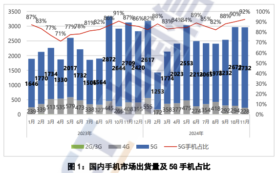 2024年11月,国内手机市场出货量同比下降5.1%,但5G手机出货量同比增长0.8%,占比92.3%。1-11月累计出货量同比增长7.2%,5G手机占比86.2%。