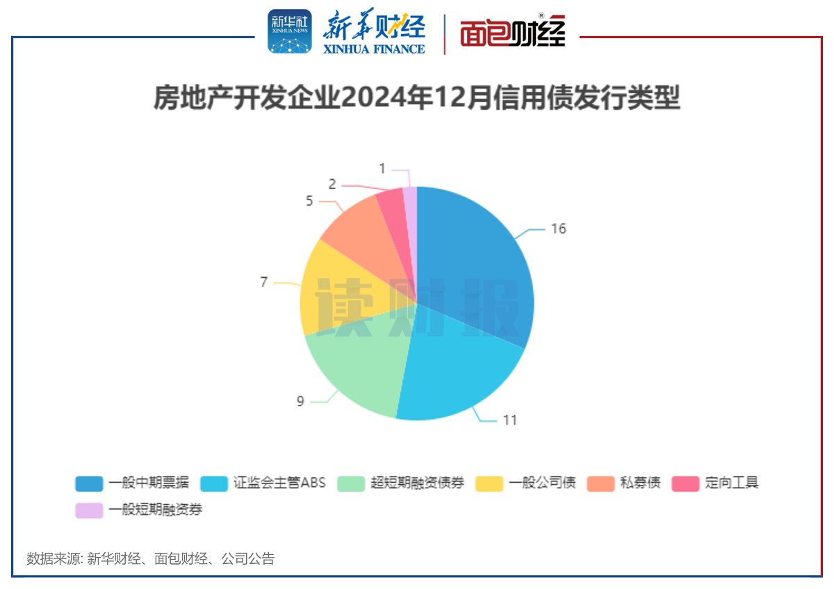 在债券类型方面,2024年12月房企发行的信用债中,一般中期票据数量最多,达到16只;证监会主管ABS和超短期融资债券分别发行11只和9只;一般短期融资券则较为少见,仅发行1只。