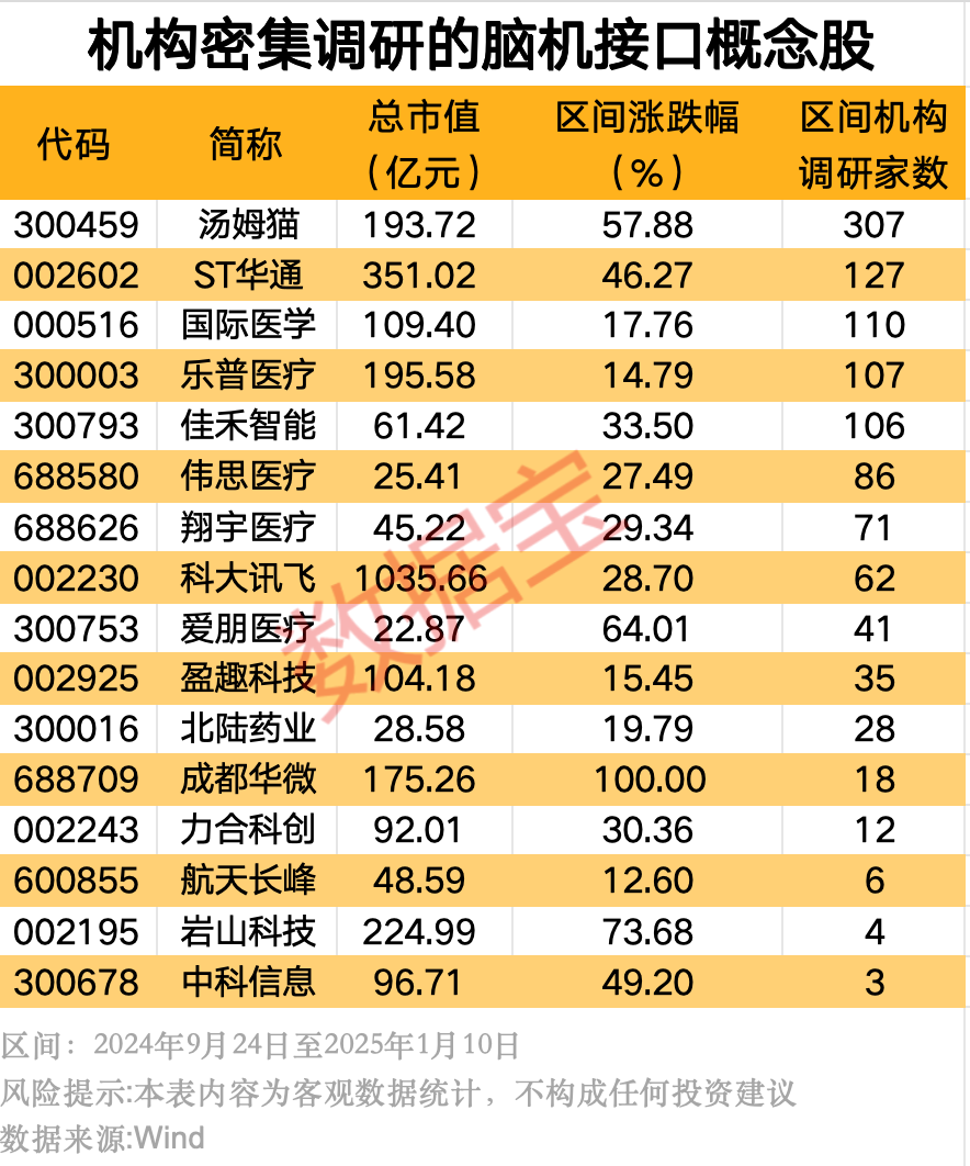 自2024年9月24日以来,脑机接口概念股悉数上涨,平均涨幅超过30%。其中,复目复华、成都华微等股价涨幅翻倍。机构调研数据显示,汤姆猫成为调研最频繁的公司,累计有307家机构参与调研。