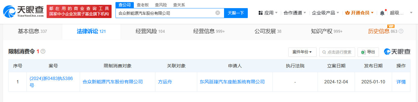 近日,天眼查法律诉讼平台披露,哪吒汽车背后的关联公司——合众新能源汽车股份有限公司及其法定代表人方运舟,因未在规定期限内履行法律文书所规定的支付义务,被桐乡市人民法院限制高消费。此次限制源于与东风延锋汽车座舱系统有限公司之间的买卖合同纠纷,此前该公司已因此案被强制执行911万余元。此外,深度风险信息显示,1月7日,北京哲合新能源科技有限公司及方运舟同样因劳动争议案件被北京市朝阳区人民法院限制高消费。