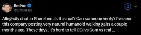 英伟达高级AI研究科学家Jim Fan看到视频后同样感到惊讶,并询问该视频的真实性,是否由Sora生成。