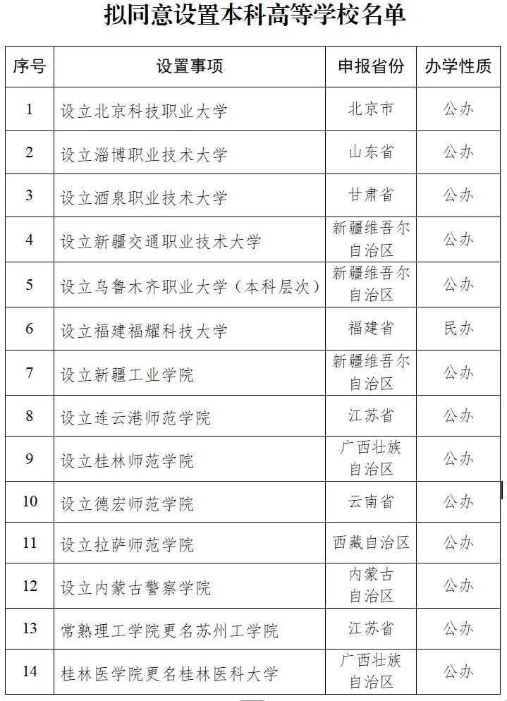 2025年1月13日,教育部官网公示了《关于拟同意设置本科高等学校的公示》,拟同意设置包括北京科技职业大学在内的14所院校,其中包括福建省的福建福耀科技大学,这也是本次公示中唯一一所民办院校。公示期为2025年1月13日至1月17日。