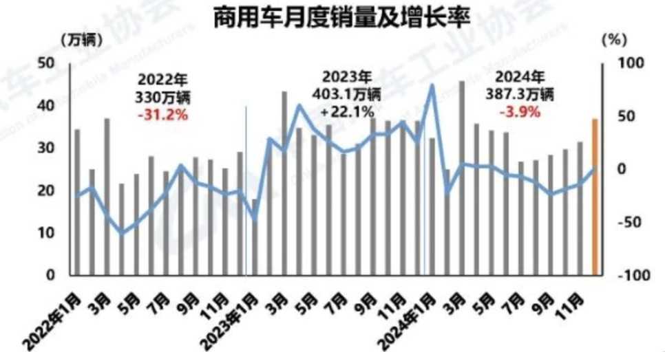 商用车方面,全年产销分别为380.5万辆和387.3万辆,同比出现5.8%和3.9%的下滑。12月份,商用车产销分别为36.1万辆和36.9万辆,环比分别增长10.2%和17.1%,产量同比下降1.5%,销量同比增长1.2%。