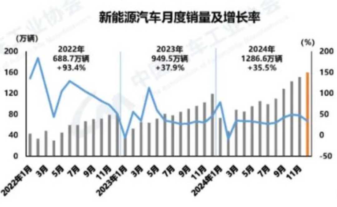 新能源汽车领域,全年产销分别达到1288.8万辆和1286.6万辆,同比分别增长34.4%和35.5%,新能源汽车销量占新车总销量的40.9%,较上一年度提高了9.3个百分点。其中,纯电动汽车销量占比为60%,虽较去年下降了10.4个百分点,但插电式混合动力汽车销量占比为40%,较去年提高了10.4个百分点,插电式混合动力汽车增长迅速,成为推动新能源汽车增长的新引擎。