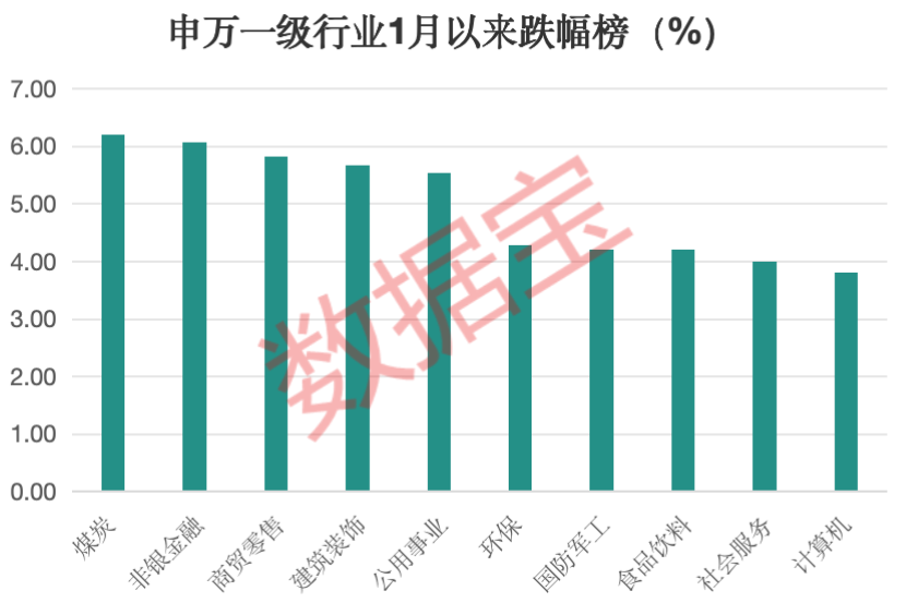 在具体行业中,煤炭板块自1月以来跌幅最大,超过6%,主要受到煤价调整的影响。2024年各煤种价格继续下跌,平均降幅达到14%,且有机构预计2025年行业供给或更为宽松,煤价中枢仍有下移压力。与此同时,非银金融板块也下跌超过6%,位居跌幅榜第二位,但该板块此前曾经历大涨行情。