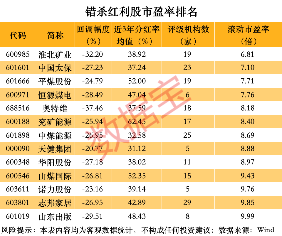 值得注意的是,很多煤炭股或许被市场错杀。数据宝统计显示,有13只股票过去3年加权净资产收益率均超10%、分红率均超30%,且最新价较去年四季度以来高点回调超20%,其中多只煤炭股上榜。这些股票的股息率和分红率均较高,盈利能力也较强。