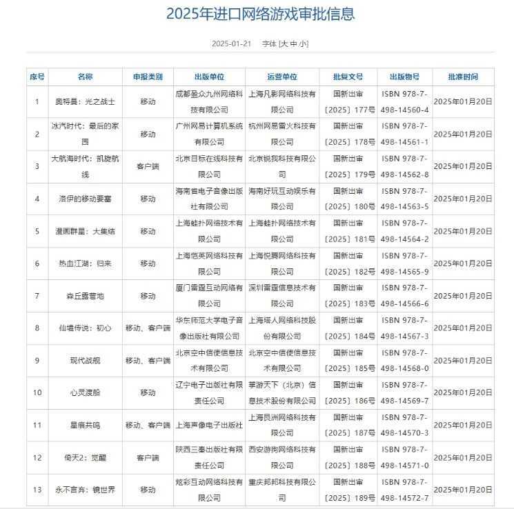 国家新闻出版署公布2025年1月进口网络游戏审批信息