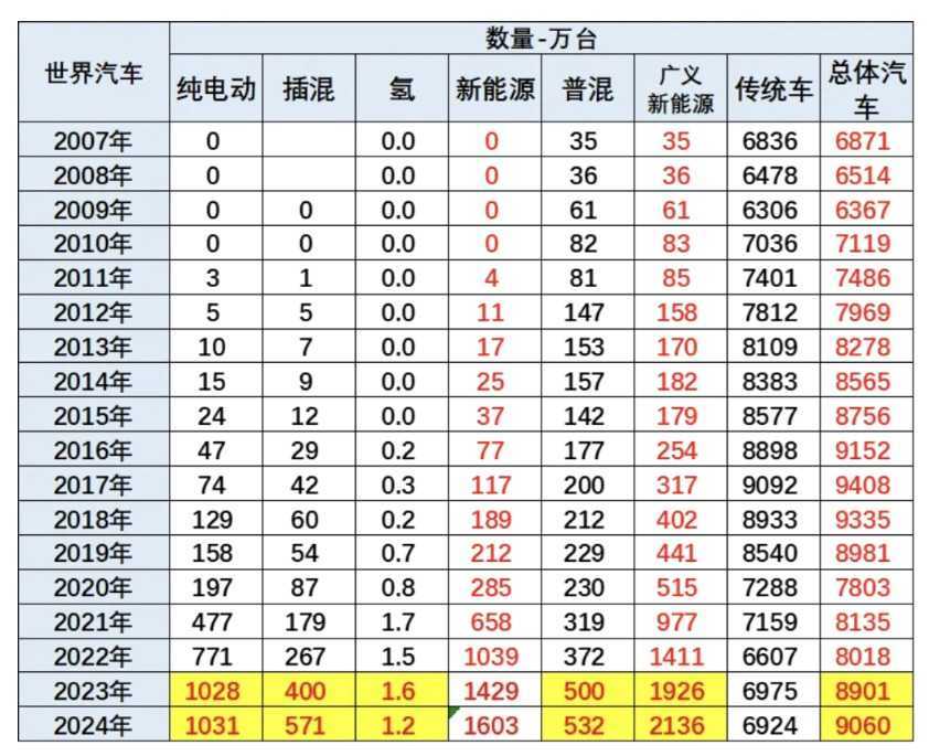 2月10日,乘联分会秘书长崔东树通过其个人微信公众号发文称,2024年1~12月份世界汽车销量达到9060万台,新能源汽车销量达到1603万台。