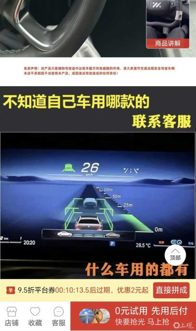 某网购平台上,记者搜索关键词“自动驾驶辅助神器”看到,平台反馈大量相关商品,划动手机屏幕,短时间竟翻不到页面的尽头。这些商品的宣传图多是在驾驶位视角拍摄,方向盘上绑着一块不到十厘米长的绒布,有的上面还插着电线。宣传图上,点出了问界、理想、小米等很多新能源车品牌。不少商品的宣传图上,还用红底白字的醒目方式写道“解放双手”、“超薄、稳定、不退出”、“安全稳定、不提醒”、“免接管”等宣传语。