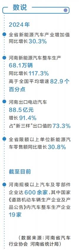 穿珠成链、聚链成群,一辆车的产业红利正在快速释放。新能源汽车产业从无到有、从有到优,正成为河南新的经济增长极。2024年,全省新能源汽车产业增加值同比增长30.3%,出口电动汽车88.5亿元,增长91.4%。一个万亿级的新能源汽车产业版图,正为河南打开高质量发展的新天地。