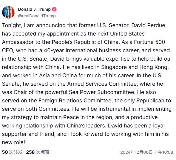 特朗普于当地时间12月5日,在其个人社交平台“真相社交”上正式发布声明,他将提名前共和党参议员戴维·珀杜(David Perdue)为下一任美国驻华大使。珀杜在2015年至2021年期间,担任佐治亚州的参议员,并且曾执掌美国参议院海权委员会主席一职,拥有丰富的政治经验和外交背景。