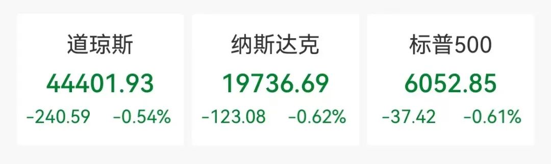 截至收盘,道琼斯工业平均指数收跌240.59点,跌幅0.54%;标普500指数收跌37.42点,跌幅0.61%;纳斯达克综合指数收跌123.08点,跌幅0.62%。