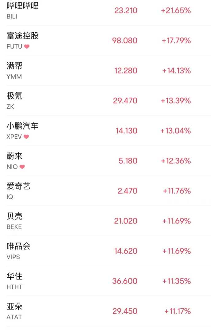 热门股方面,房多多涨幅超过52%,哔哩哔哩涨幅超过21%,蔚来汽车和小鹏汽车涨幅均超过12%,爱奇艺涨幅超过11%,京东涨幅达11%,拼多多和网易涨幅均超过10%。