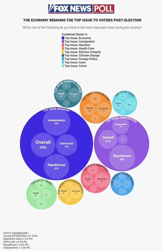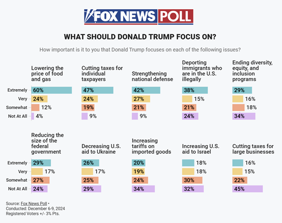 经济问题仍是选民最为关心的首要议题(34%),移民和边境安全次之(21%),医疗保健位居第三(8%)。此外,约60%的受访者认为,特朗普应重点关注削减食品和汽油价格,这一议题被视为“极其”重要。个人减税(47%)和加强国防(42%)则分别位列其后。