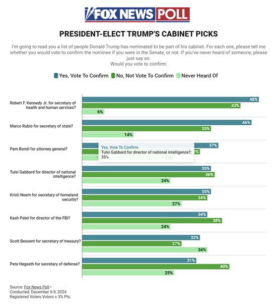 此外,特朗普提名的卫生与公众服务部部长小罗伯特·肯尼迪的支持率也较高,约48%的人表示将投票支持,约43%的人表示反对。特朗普提名的司法部长帕姆·邦迪和财政部长斯科特·贝森特的支持率也高于反对率5个百分点以上。