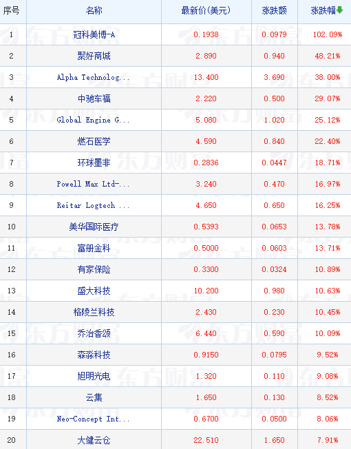 领涨中概股列表详细展示了市场表现优异的个股。