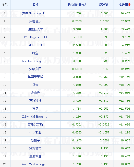 领跌中概股列表则揭示了市场表现不佳的个股。