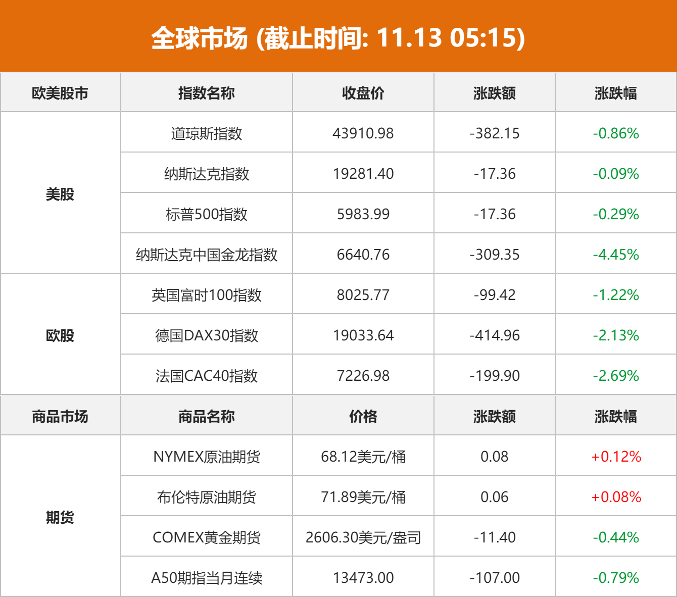 商品市场动态:国际油价方面,呈现上涨趋势。纽约商品交易所12月交货的轻质原油期货价格上涨8美分,收于每桶68.12美元,涨幅为0.12%;2025年1月交货的伦敦布伦特原油期货价格也上涨6美分,收于每桶71.89美元,涨幅为0.08%。然而,国际金价则收跌,COMEX黄金期货下跌11.40美元/盎司,跌幅0.44%,报2606.30美元/盎司。