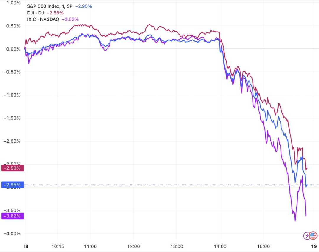 美东时间周三,美股市场因降息前景黯淡而大幅下跌,三大指数均跌超2.5%,创下最长连跌纪录。同时,热门股普遍收跌,多家知名公司发布了重要消息。